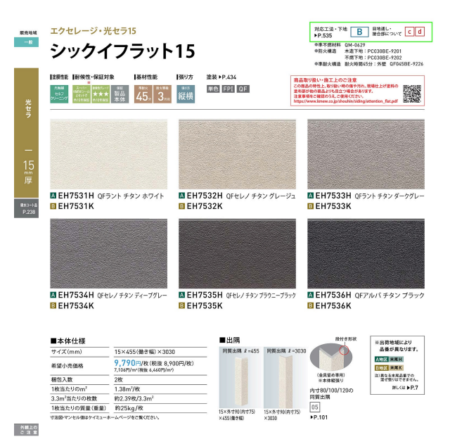 今回、現場で使用しているのは、ケイミュー(KMEW)の**「エクセレージ・光セラ15」シリーズ。 その中でも、漆喰の風合いを再現した「シックイフラット15」の「QFアルバチタン ブラック(EH7536H)」**というモデルです